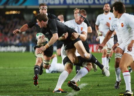 Pasaulio regbio čempionato finalas: prancūzų regbininkas griauna Naujosios Zelandijos žaidėją, taip laikinai sutrikdydamas puolimą.