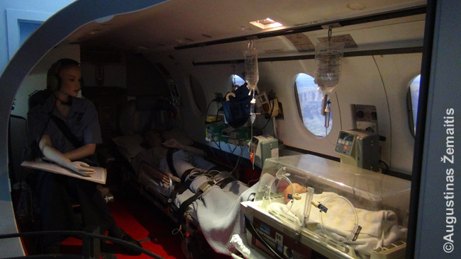 Karališkosios skraidančių daktarų tarnybos lėktuvo vidus. Galima gabenti ir ligonius, ir naujagimius.