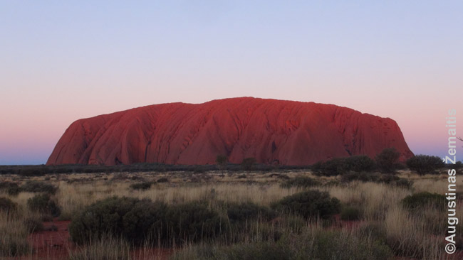 Žymiausios Australijos šiaurėje Uluru uolos spalvos kinta kartu su laikrodžiu. Čia ji - po saulėlydžio.