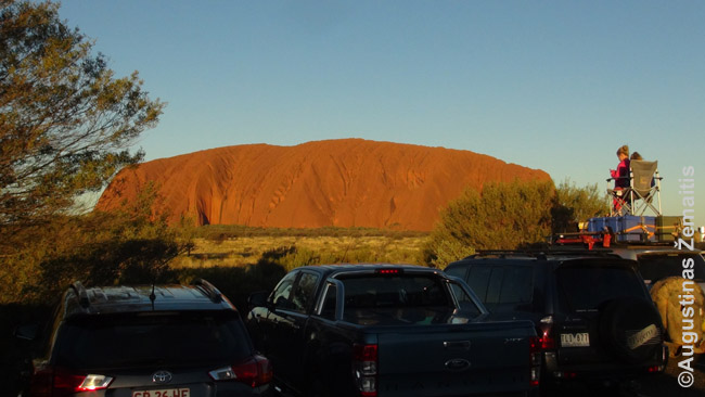 Turistai irgi turi būtinus ritualus, vienas svarbiausiųjų – stebėti Uolą iš toliau, kai besileidžianti saulė uoliai keičia jos spalvas. Pasistatę kėdes, sulipę ant automobilių, susijungę “timelapse” fotoaparatus saulėlydį su mumis stebėjo ištisa minia. Kitas “gamtos spektaklis” būna saulei tekant. Dar du – jai tekant ir leidžiantis virš Kata Čuta. Tai – aukštesnės (iki 546 m.), bet siauresnės uolos už 50 km; dažnam atvykėliui jos net nustelbia savo “garsesnę seserį”, nes ten važiuodami nieko nesitiki.