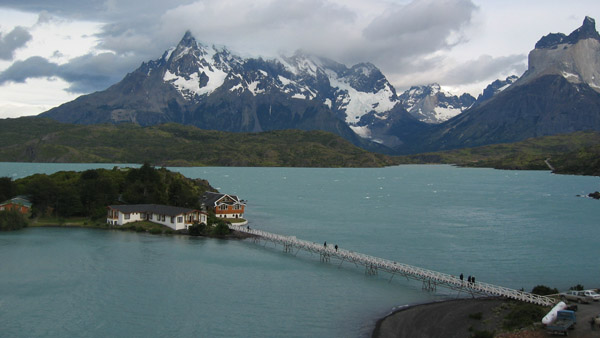 Atšiaurus Torres Del Paine nacionalinio parko peizažas. Saloje - viešbutis.