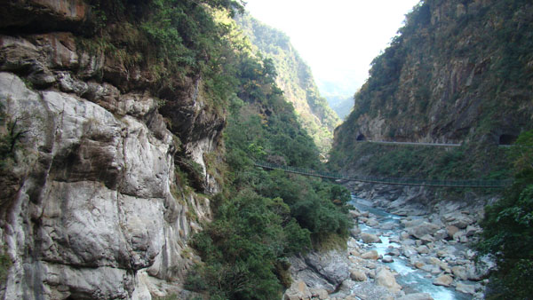 Taroko tarpeklio didybė. Nuotraukoje sunku ją perteikti, nes pačiose įspūdingiausiose vietose tarpeklis buvo toks siauras ir aukštas, kad, norėdamas suvokti jo mastus, privalėjai žiūrėti į visas puses, aukštyn ir žemyn. Čia - viena mažiau įspūdingų vietų.