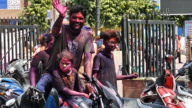 Kitą rytą miestas buvo nesuvokiamai tylus… Lietuvoje gal neatkreiptume dėmesio, bet tik ne Indijoje, kur visada žmonių minios, pypimai, riksmai. Savaitgaliais tai nenurimsta, bet per Holi viskas buvo uždaryta. Vis gausėjo „spalvotų“ žmonių. Spalvų vienas ant kito jie nepurškia, o tepa ant veido. Kiekviena spalva – tai kitas palinkėjimas. Geltona – linki sėkmės, raudona – meilės, violetinė – pamaldumo… Spalvų purškimas, spalvoti dūmai – retenybė palyginus su tepimu.