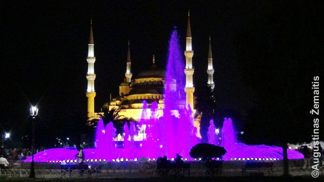 Mėlynoji mečetė su moderniu daugiaspalviu fontanu priešais