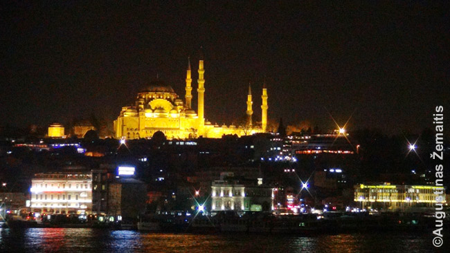 Mečetė virš Stambulo naktį žvelgiant nuo Aukso rago.