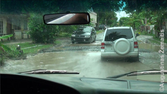 Pirmadienį ekskursiją pėsčiomis sau suorganizavome patys. Aistė nejaukiai jautėsi, matydama į savo krepšelį įbestus aplinkinių žvilgsnius. O gal jie tiesiog mintyse juokėsi iš mano šlubčiojimo. Aplankėme dvokiančią parduotuvę, kur pirmąjį paimtą sulčių buteliuką teko nešti atgal lentynon kai išvydome, jog galiojimo laikas jau seniai pasibaigęs. Dar – kinų restoraną: stebėtinai padorų, su vaizdu į mažytį uostą. Ilgųjų katerių ten plaukiojo dar daugiau, nei Madžūre ar Ponpėjuje, nes juk Čiukas yra ne viena didelė sala, apsupta salelių, o kelių didesnių salų grupė. Beje, po didelių liūčių veikiausiai kiekvienas namas tampa savotiška sala, juk štai ir dabar, praėjus jau nemažai laiko po paskutinio lietaus, gatvėmis buvo sunku žingsniuoti dėl milžiniškų purvino vandens sklidinų duobių. Apie šaligatvius, aišku, nėra ko nė svajoti.