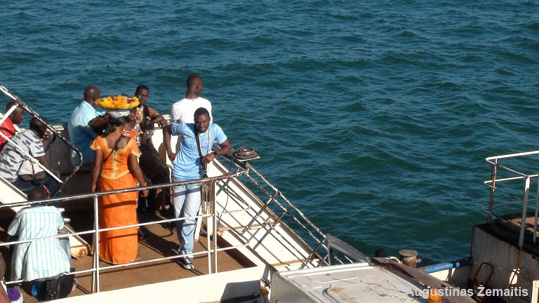 Į chaotišką keltų uostą atvykome vieni pirmųjų. Tik joks keltas mūsų nelaukė. Uosto darbuotojai kalbėjo apie nemažą vėją, bet šio laivo reputacija ir šiaip prasta: iš keturių variklių beveikia vienas vienintelis. Net ir suvažiavus ant denio teko dar valandą laukti – pasirodo, dviejų baltų visureigių, kuriais plaukę svarbūs asmenys vėliau pasuko į Senegalą. Barą pasiekėme vėluodami tris valandas, o aplink prisižiūrėjome visko. Moterų su nešuliais ant galvos, aukštutiniame denyje sėdinčių baltųjų turistų, supuvusių, bet itin ryškių sunkvežimių ir valstybiniais numeriais „Judiciary“ padabintą automobilį vairuojančių teisėjų, tarpusavyje bendravusių tik „prestižine“ anglų kalba.